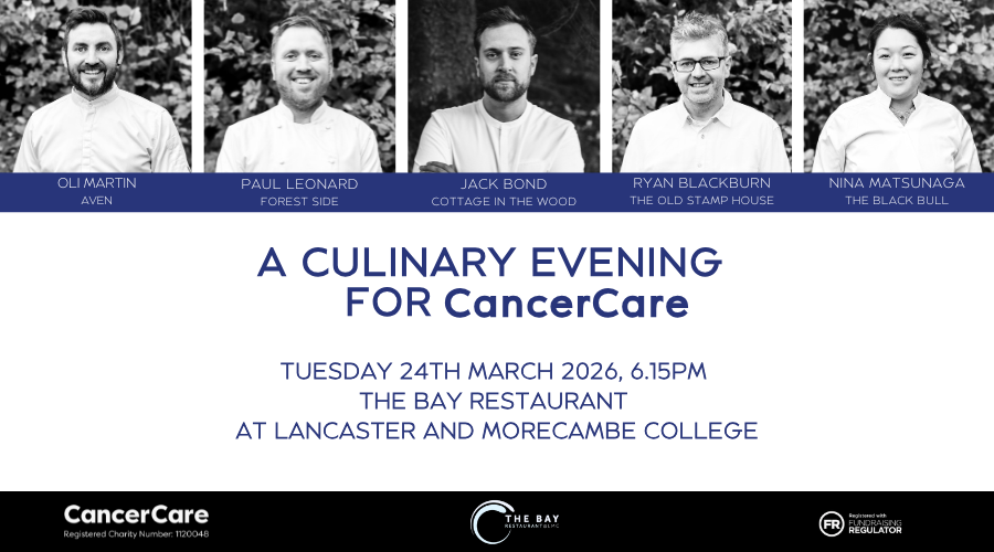 Join us for A Culinary Evening for CancerCare on Tuesday 24th March 2026 at 6.15pm held at The Bay Restaurant at Lancaster and Morecambe College.